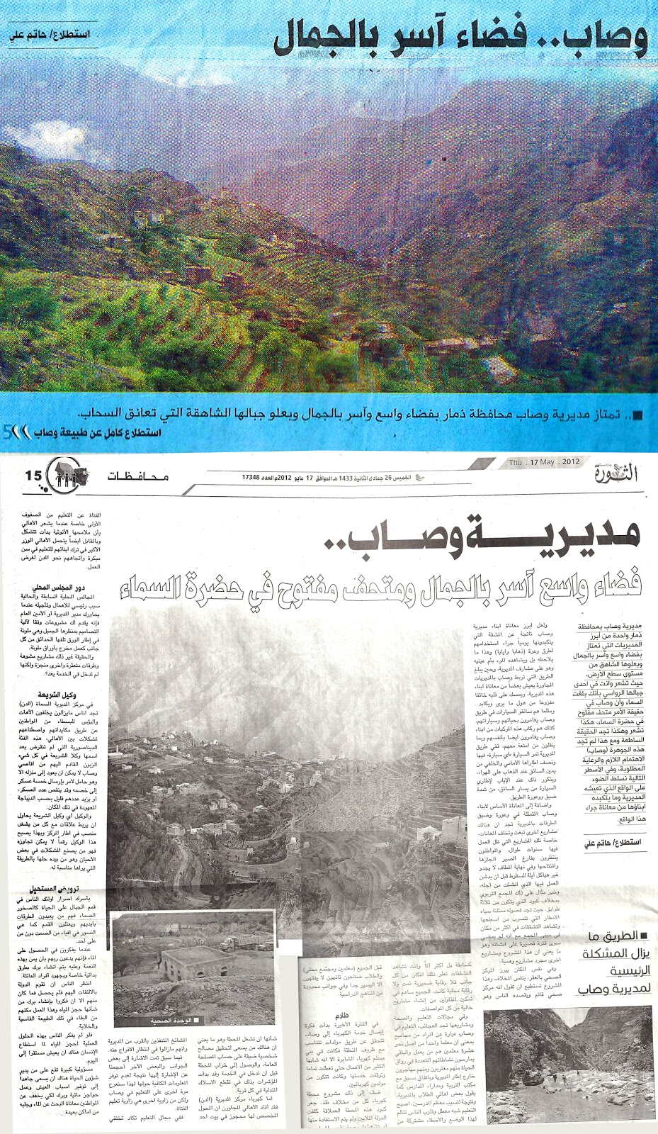 مديرية وصاب بمحافظة ذمار واحدة من أبرز المديريات التي تمتاز بفضاء واسع وآسر بالجمال وبعلوها الشاهق من مستوى سطح الأرض، حيث تشعر وانت في احدى جبالها الرواسي بأنك بلغت السماء وأن وصاب في حقيقة الأمر متحف مفتوح في حضرة السماء، هكذا تشعر وهكذا تجد الحقيقة الساطعة ومع هذا لم تجد هذه الجوهرة (وصاب) الاهتمام اللازم والرعاية المطلوبة، وفي الأسطر التالية نسلط الضوء على الواقع الذي تعيشه المديرية وما يتكبده ابناؤها من معاناة جراء هذا الواقع.